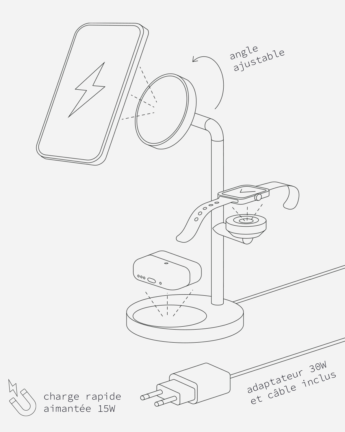 Votre nouvel allié productivité ! Utilisez votre téléphone comme centre de notifications, à votre bureau et passez vos appels visio les mains libres ! Chargez en même temps votre téléphone, votre montre et vos écouteurs. Vous allez adorer ses finitions soignées, son angle ajustable et son design épuré.